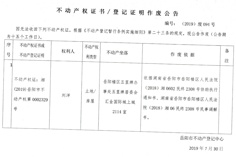 不动产权证书、登记证明作废公告 编号: (2019)废094号(刘洋,不动产权证湘(2019)岳阳市不动产权第0002329号)