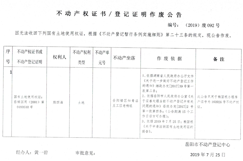 不动产权证书、登记证明作废公告 编号: (2019)废092号(熊四海,国有土地使用权证岳楼国用(2001)第0480610号)