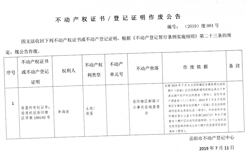 不动产权证书、登记证明作废公告 编号: (2019)废084号(李海波,房屋所有权证号岳房权证岳阳楼区字第109180号)