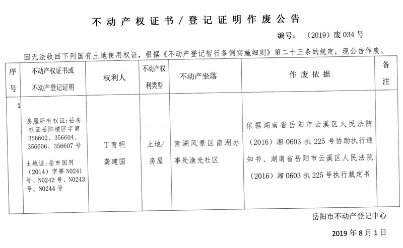 不动产权证书、登记证明作废公告 编号: (2019)废034号(丁育明、龚建国,房屋所有权证356602、356604、356606、356607号,国有土地使用权证岳市国用(2014)字第N0241号、N0242号、N0243号、N0244号)