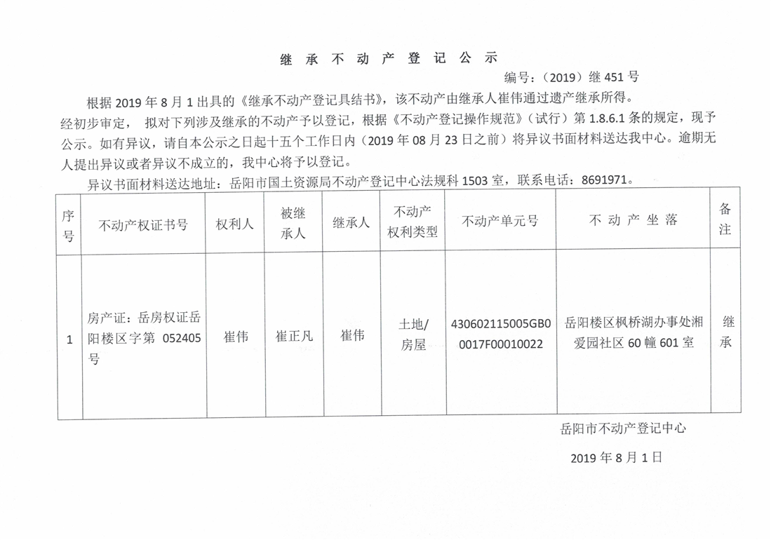 继承不动产登记公示 编号:(2019)继451号(崔伟)
