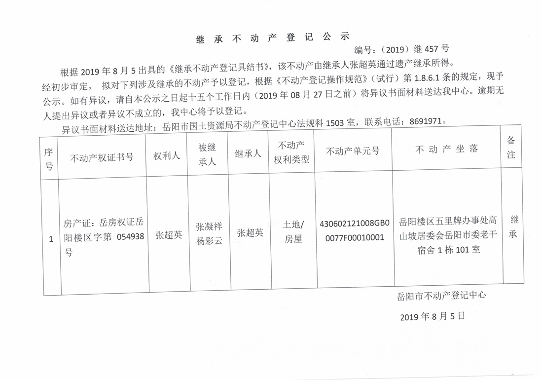 继承不动产登记公示 编号:(2019)继457号(张超英)