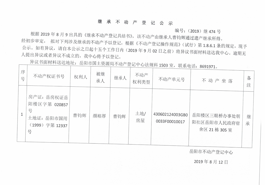 继承不动产登记公示 编号:(2019)继474号(曹钧辉)