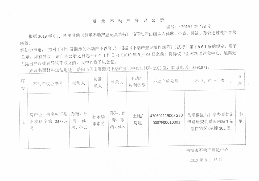 继承不动产登记公示 编号:(2019)继号478号(孙青)