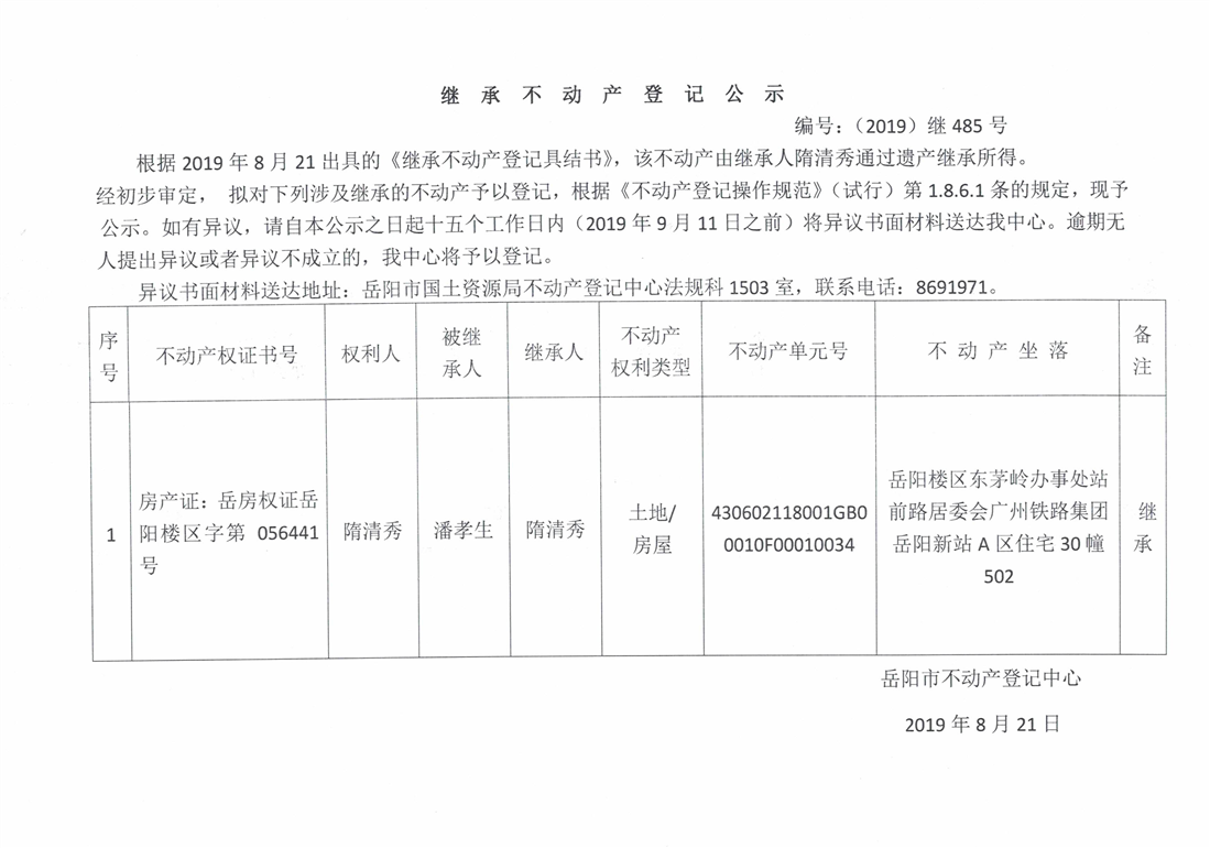 继承不动产登记公示 编号:(2019)继485号(隋清秀)