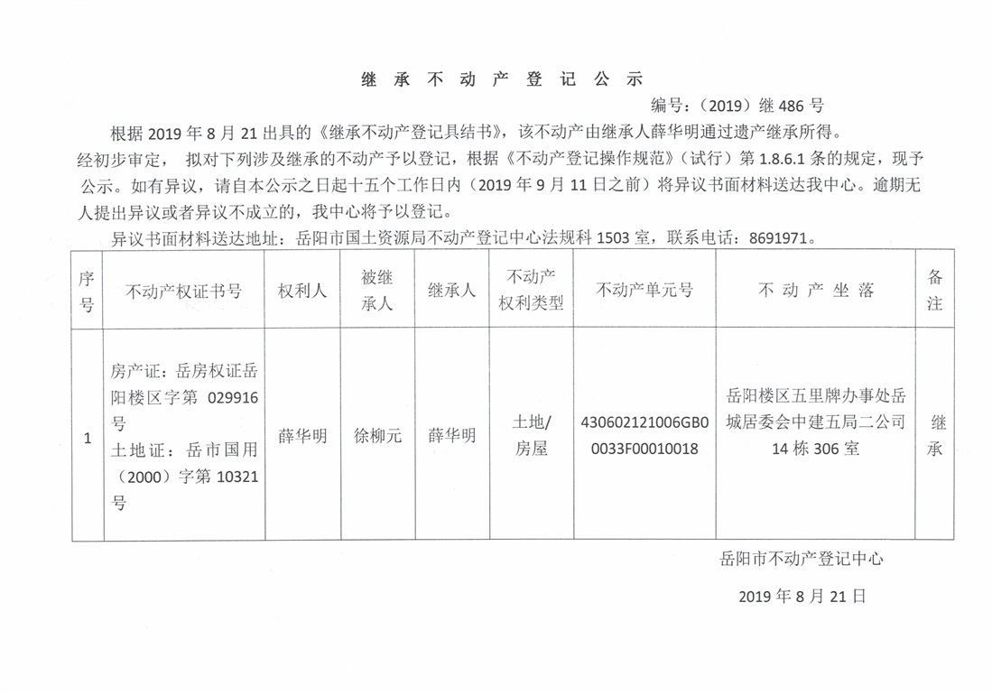 继承不动产登记公示 编号:(2019)继486号(薛华明)