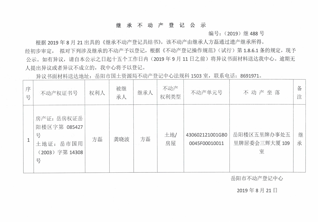继承不动产登记公示 编号:(2019)继488号(方磊)