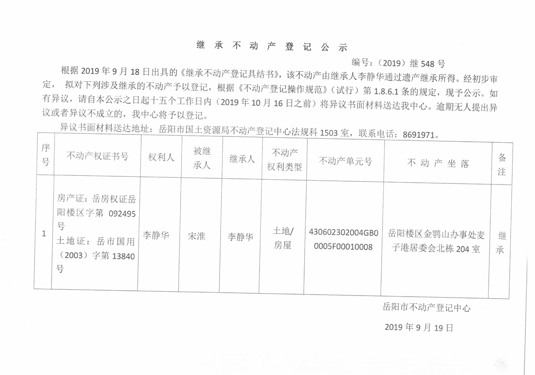 继承不动产登记公示 编号:(2019)继548号(李静华)