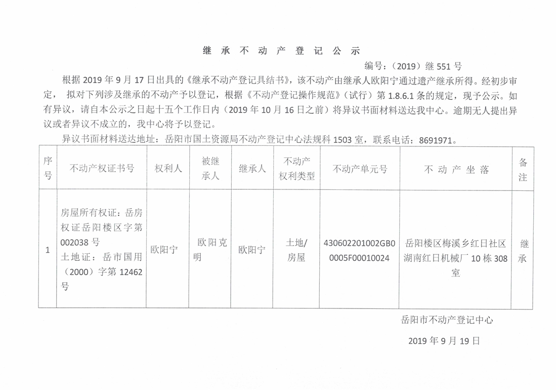 继承不动产登记公示 编号:(2019)继551号(欧阳宁)