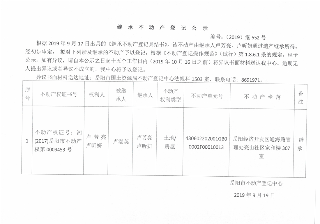继承不动产登记公示 编号:(2019)继552号(卢芳亮)