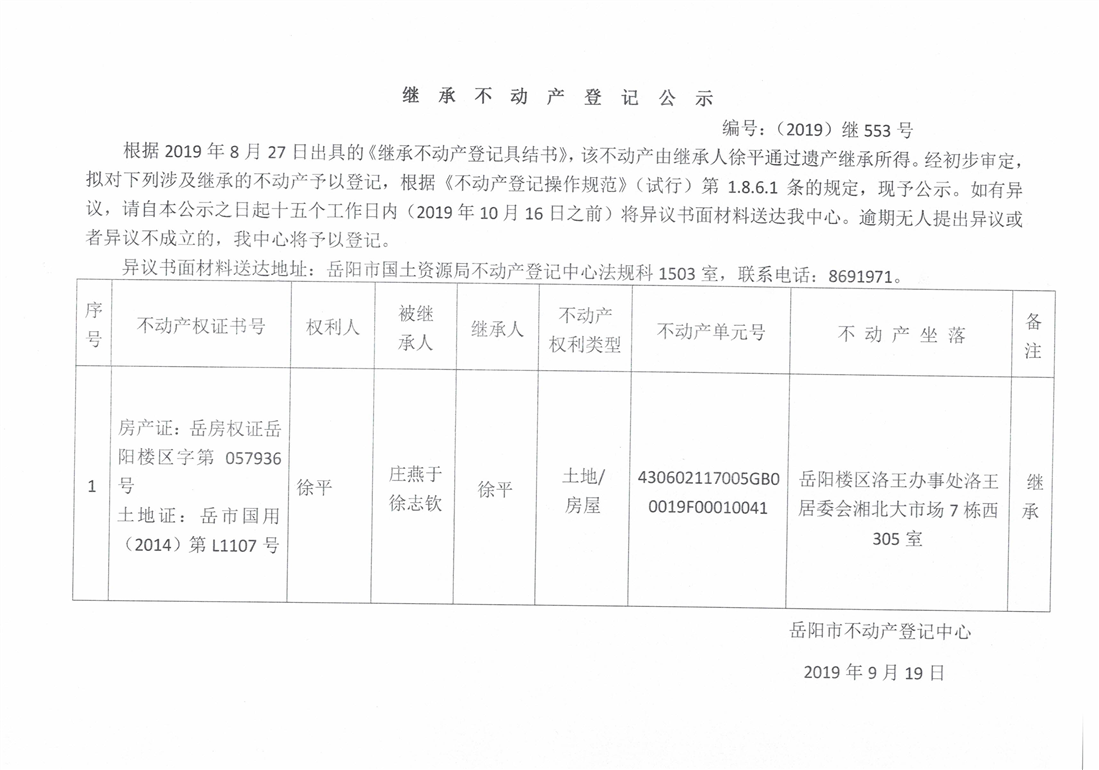 继承不动产登记公示 编号:(2019)继553号(徐平)