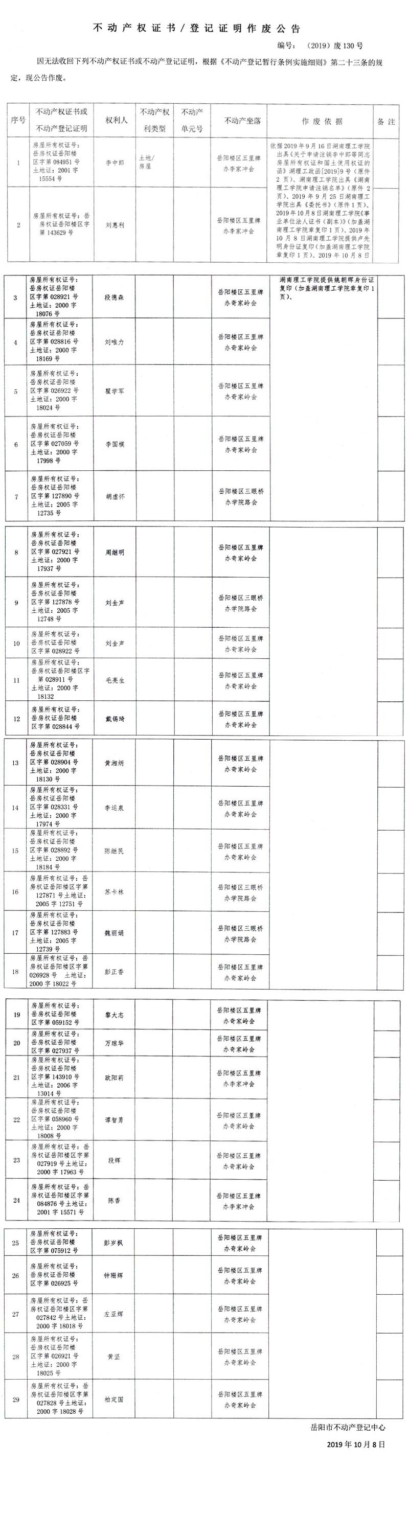 不动产权证书、登记证明作废公告 编号: (2019)废130号(李中郎等岳阳理工学院29户)