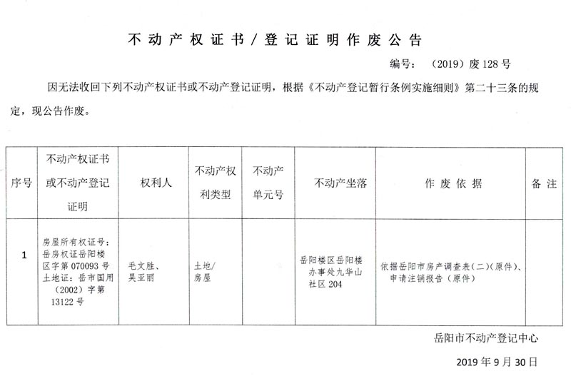 不动产权证书、登记证明作废公告 编号: (2019)废128号(毛文胜、吴亚丽,房屋所有权证号岳房权证岳阳楼区字第070093号,国有土地使用权证岳市国用(2002)字第13122号)