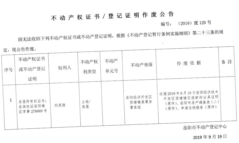 不动产权证书、登记证明作废公告 编号: (2019)废120号(刘其胜,房产证岳房权证岳阳楼区字第278869号)