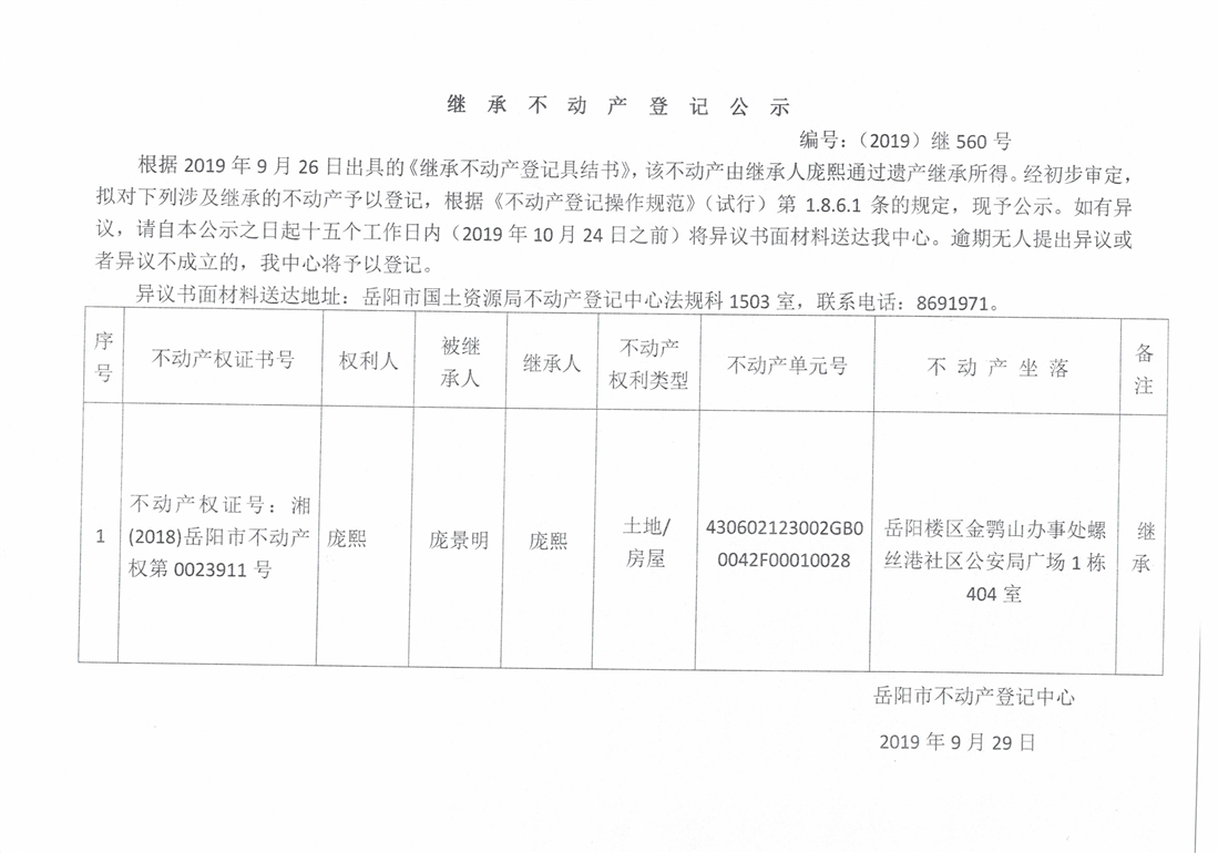 继承不动产登记公示 编号:(2019)继560号(庞熙)
