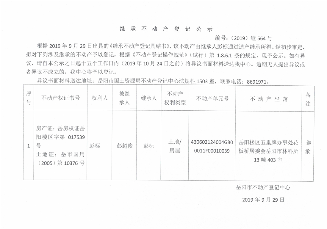 继承不动产登记公示 编号:(2019)继564号(彭标)
