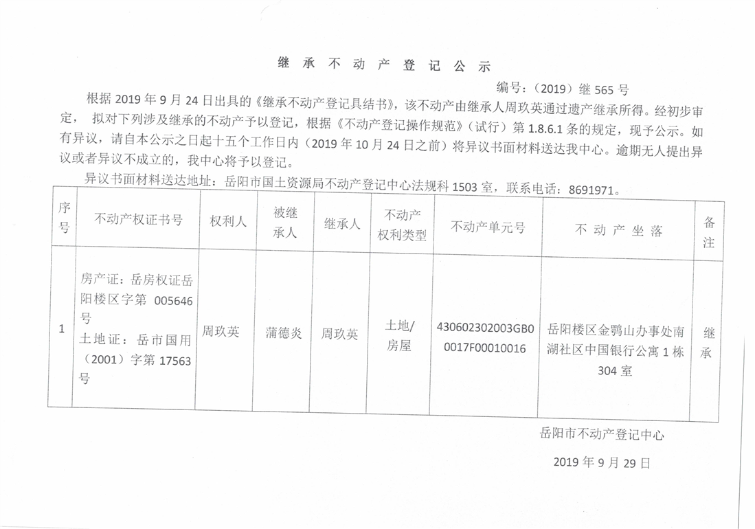 继承不动产登记公示 编号:(2019)继565号(周玖英)