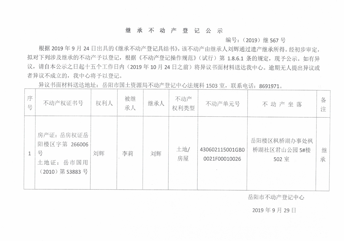 继承不动产登记公示 编号:(2019)继567号(刘辉)