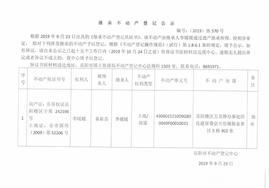 继承不动产登记公示 编号:(2019)继570号(李媛媛)