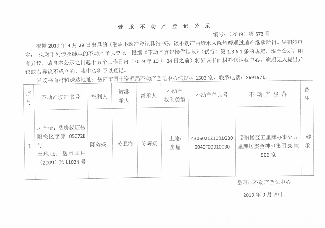 继承不动产登记公示 编号:(2019)继573号(陈辉媛)