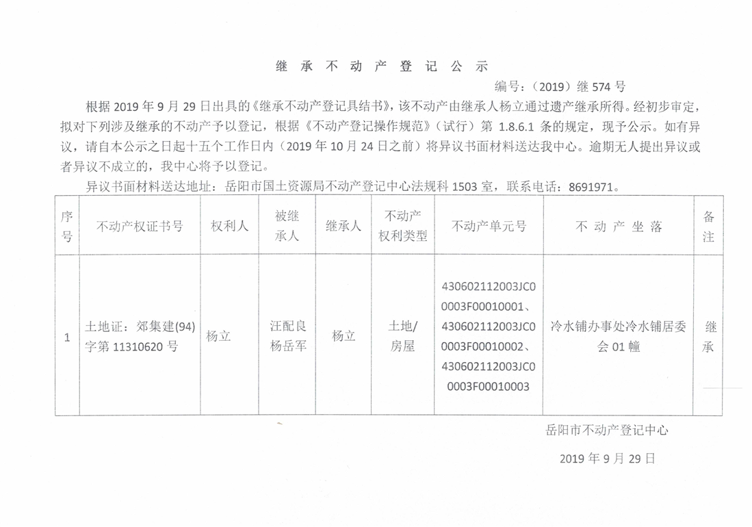 继承不动产登记公示 编号:(2019)继574号(杨立)