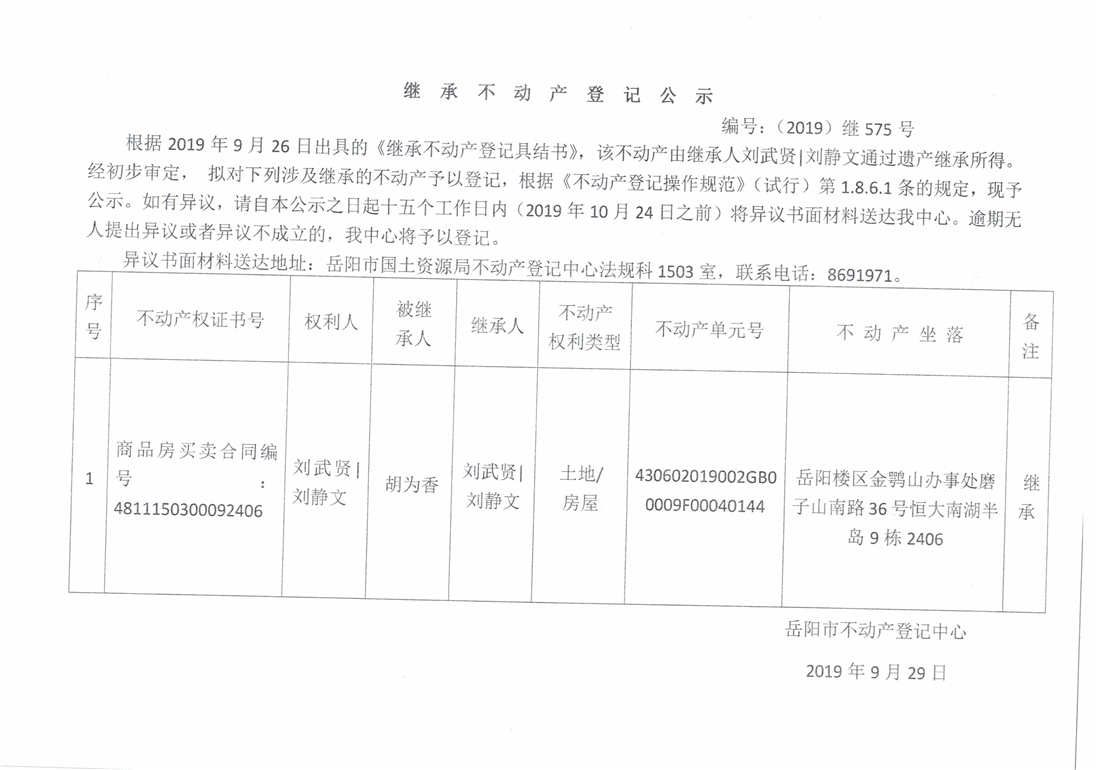 继承不动产登记公示 编号:(2019)继575号(刘静文)