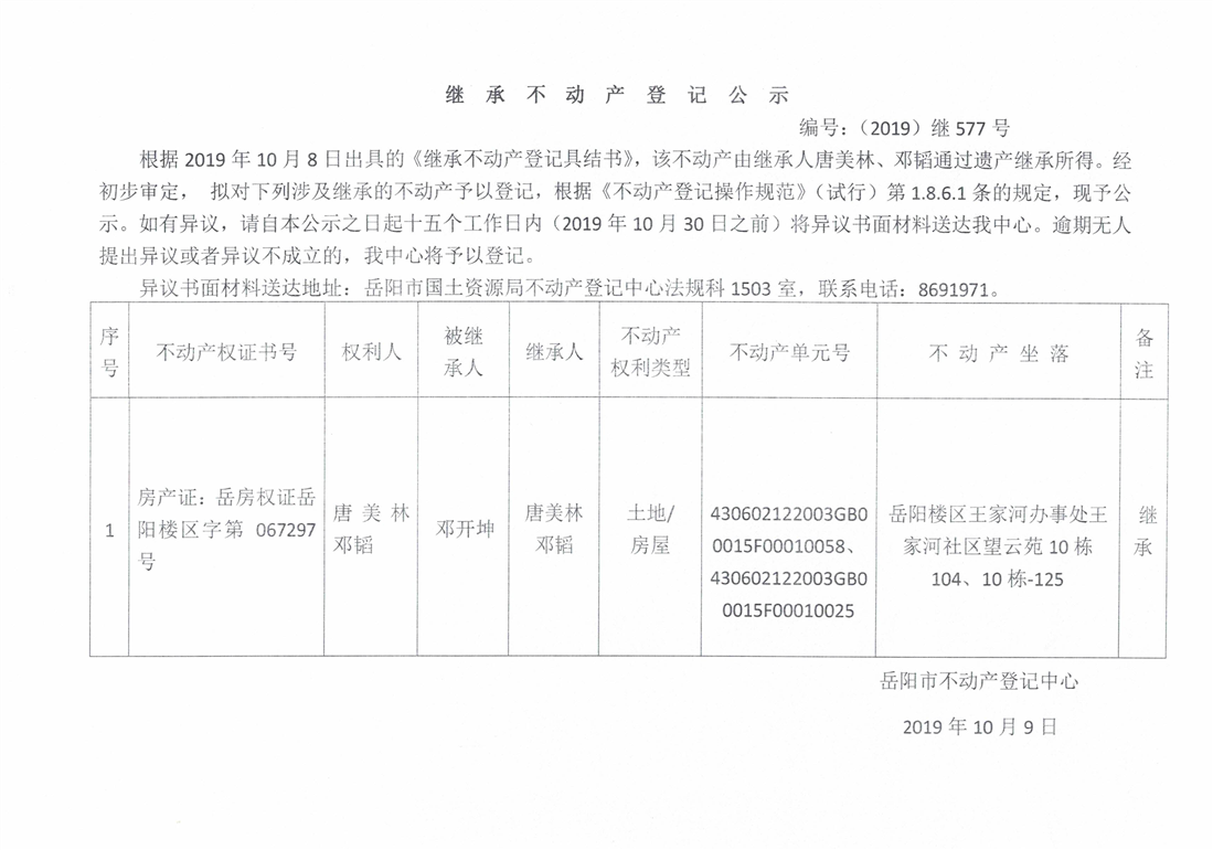 继承不动产登记公示 编号:(2019)继577号(唐美林)