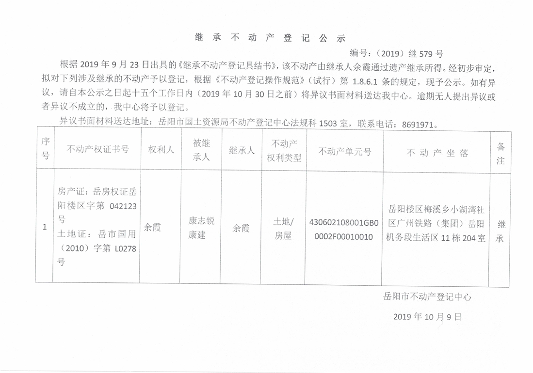 继承不动产登记公示 编号:(2019)继579号(余霞)