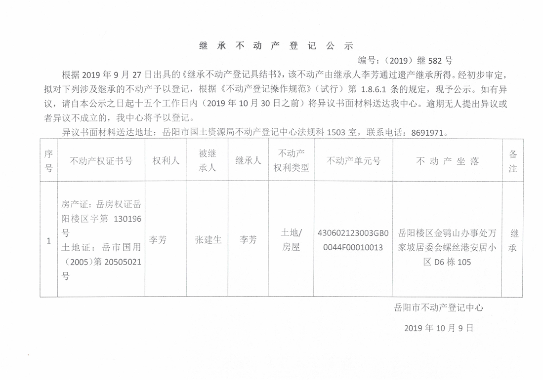 继承不动产登记公示 编号:(2019)继582号(李芳)