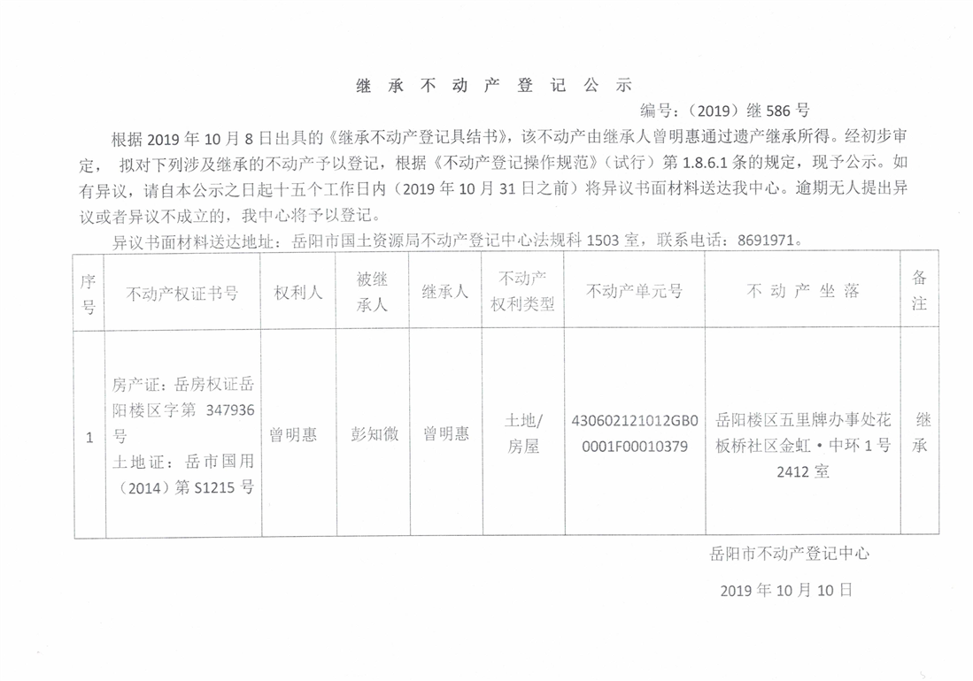继承不动产登记公示 编号:(2019)继586号(曾明惠)