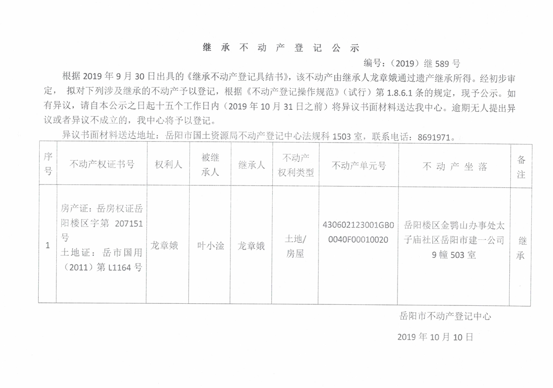 继承不动产登记公示 编号:(2019)继589号(龙章娥)