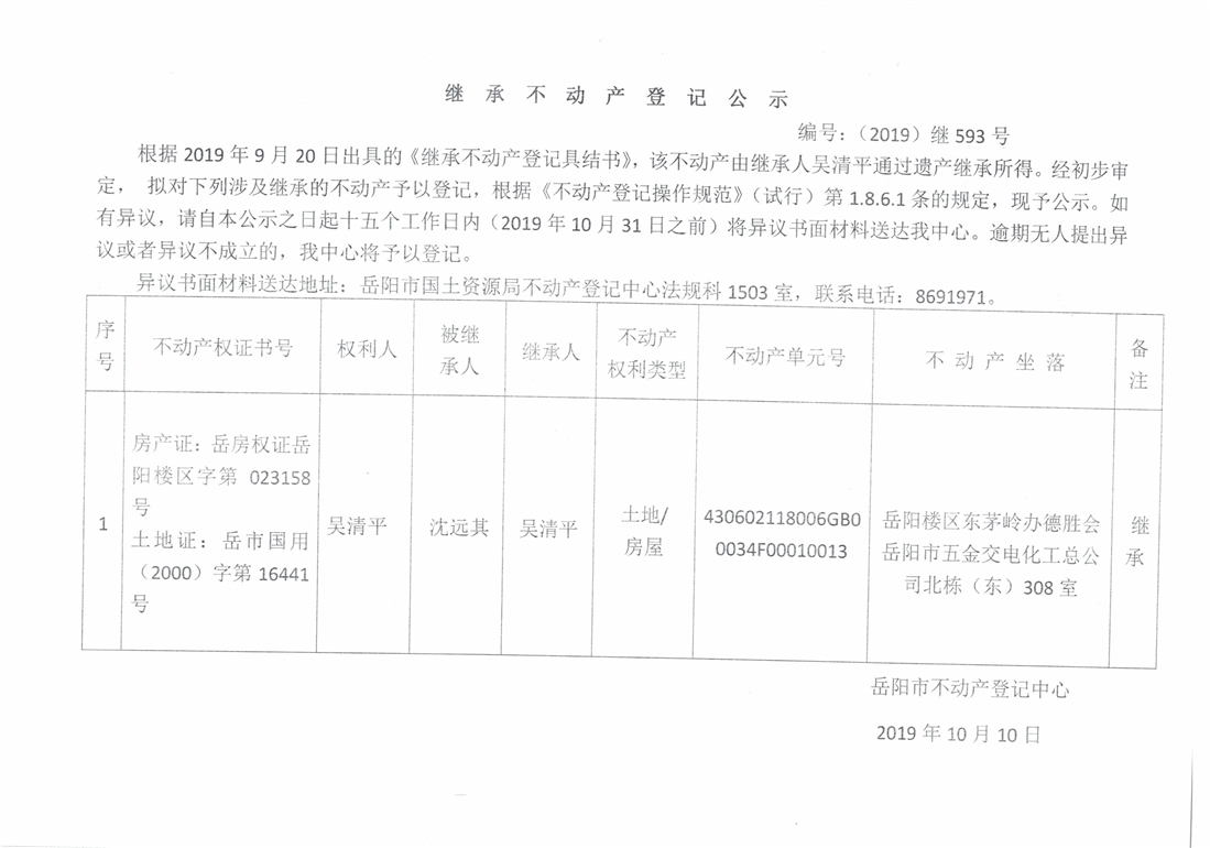 继承不动产登记公示 编号:(2019)继593号(吴清平)