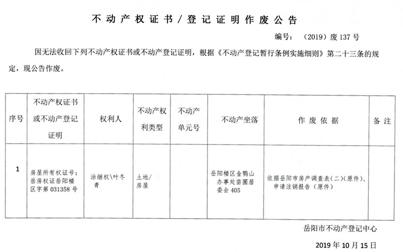 不动产权证书、登记证明作废公告 编号:(2019)废137号(涂继权、叶冬青,房屋所有权证031358号)