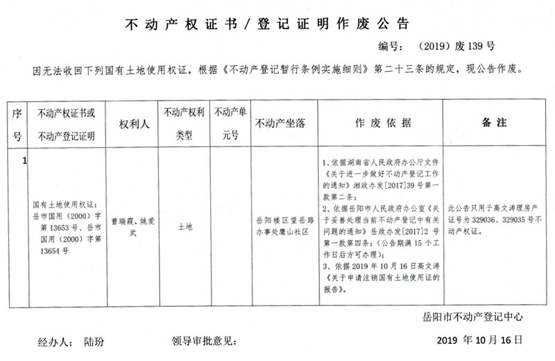 不动产权证书、登记证明作废公告 编号:(2019)废139号(曹瑞霞、姚爱武,土地证岳市国用(2000)字第13653号、岳市国用(2000)字第13654号)