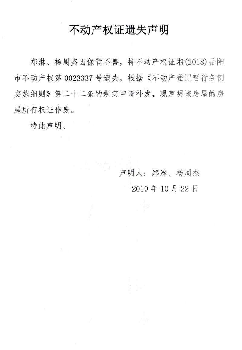 不动产权证遗失声明(郑淋、杨周杰,湘(2018)岳阳市不动产权第0023337号)