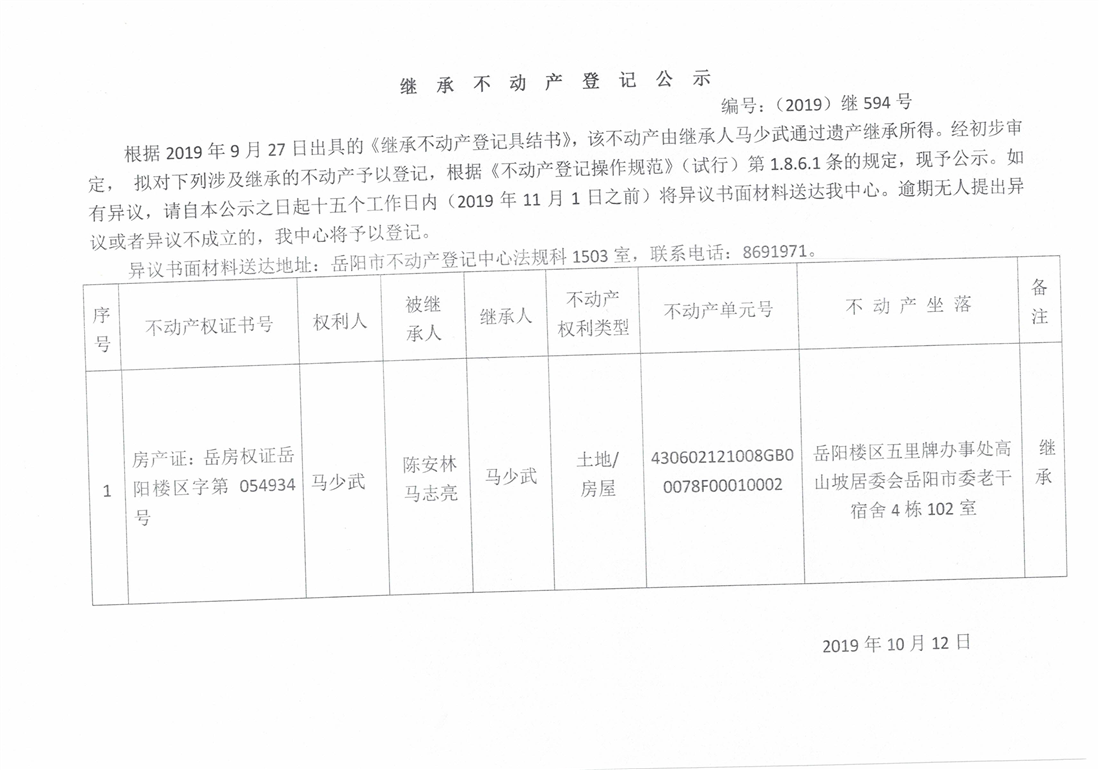 继承不动产登记公示 编号:(2019)继594号(马少武)