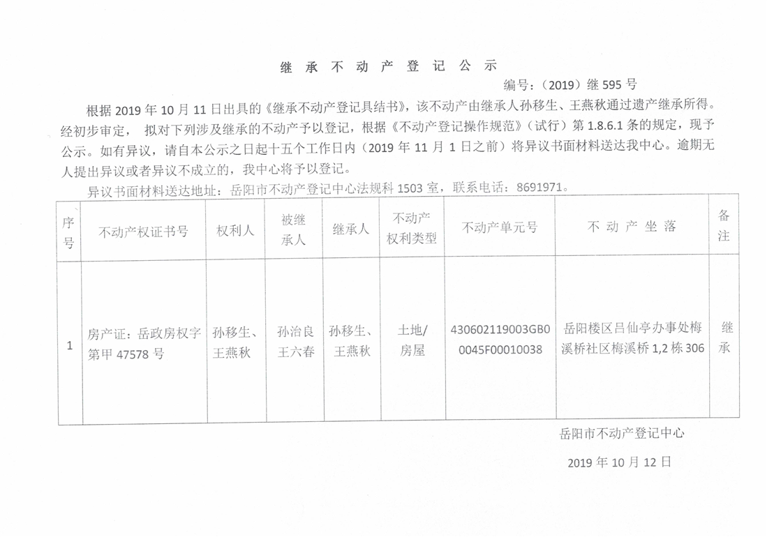 继承不动产登记公示 编号:(2019)继595号(孙移生)