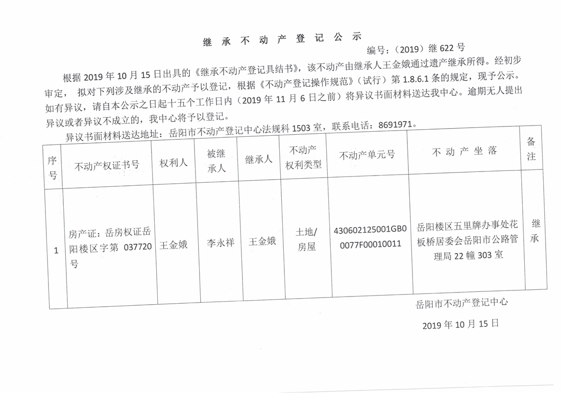 继承不动产登记公示 编号:(2019)继622号(王金娥)