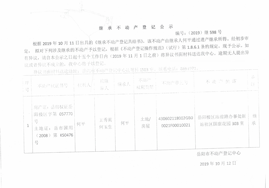 继承不动产登记公示 编号:(2019)继598号(何平)