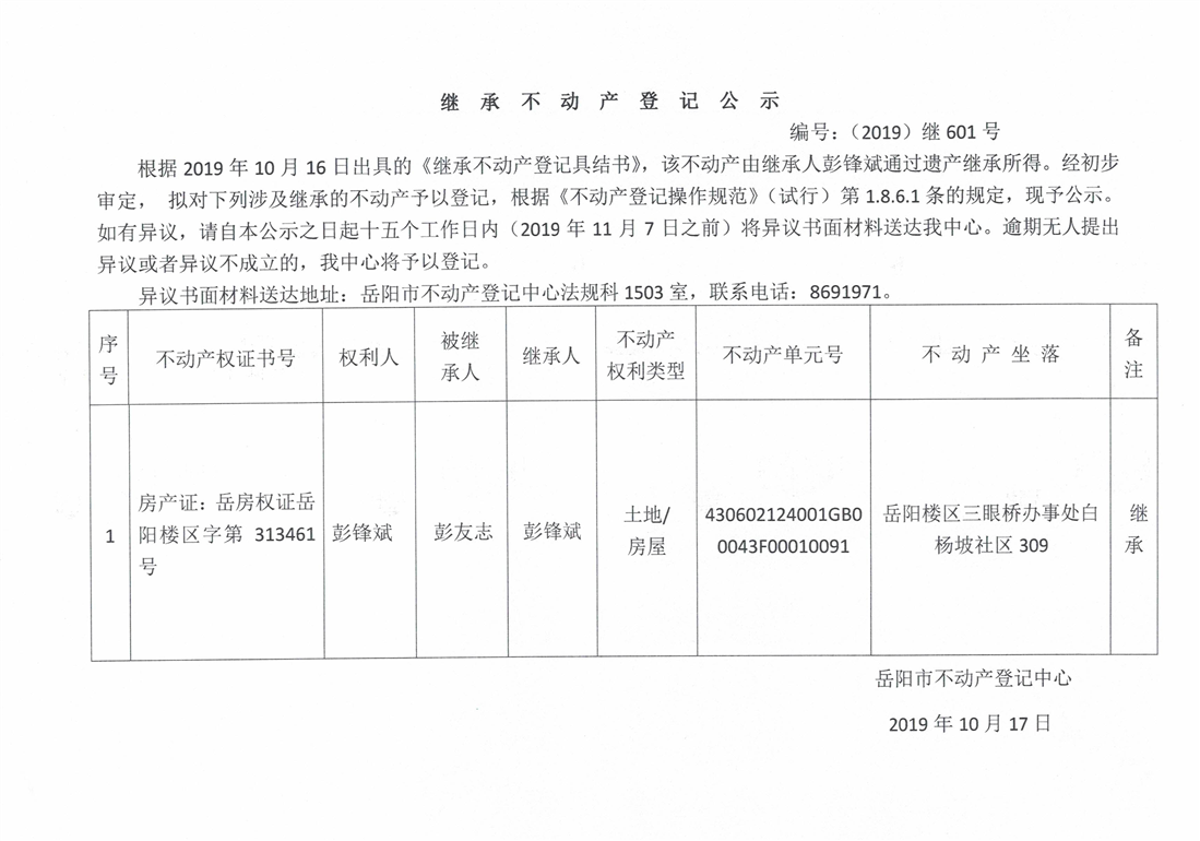 继承不动产登记公示 编号:(2019)继601号(彭锋斌)
