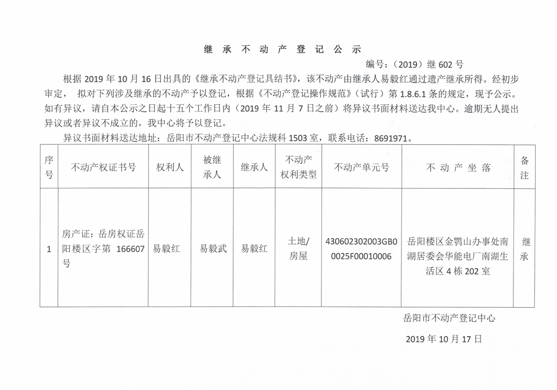 继承不动产登记公示 编号:(2019)继602号(易毅红)