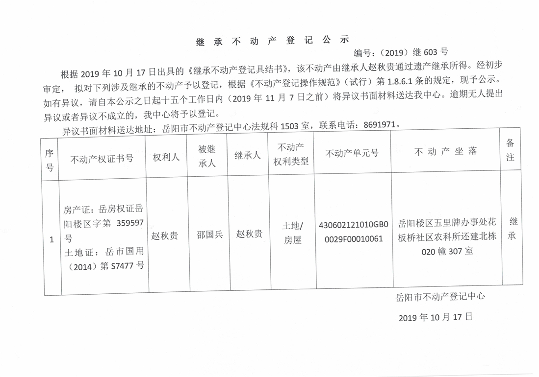 继承不动产登记公示 编号:(2019)继603号(赵秋贵)