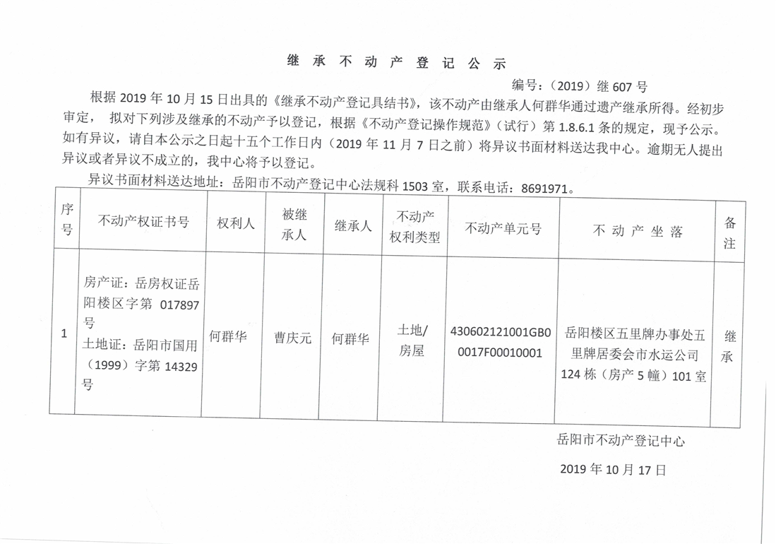 继承不动产登记公示 编号:(2019)继607号(何群华)