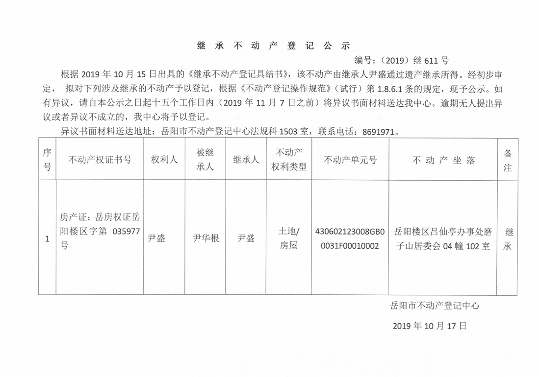 继承不动产登记公示 编号:(2019)继611号(尹盛)