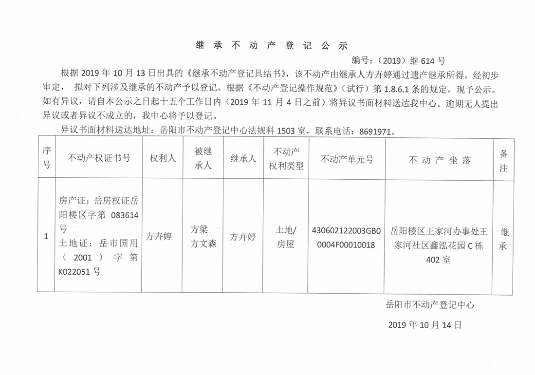 继承不动产登记公示 编号:(2019)继614号(方卉婷)