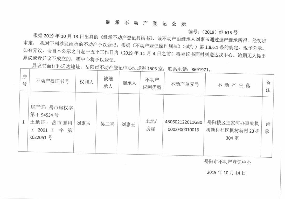 继承不动产登记公示 编号:(2019)继615号(刘惠玉)