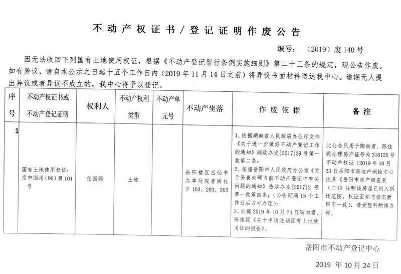 不动产权证书、登记证明作废公告 编号: (2019)废140号(任国强,国有土地使用权证岳市国用(96)第101号)