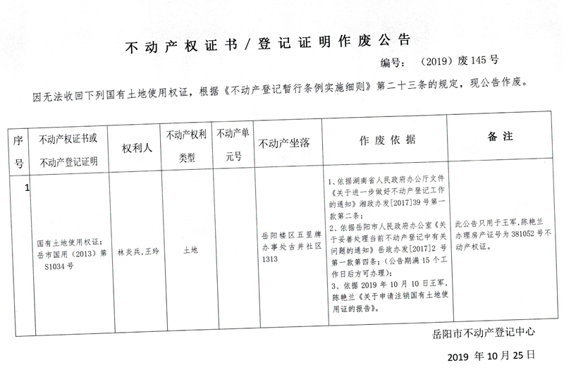 不动产权证书、登记证明作废公告 编号: (2019)废145号(林炎兵、王玲,国有土地使用权证岳市国用(2013)第S1034号)