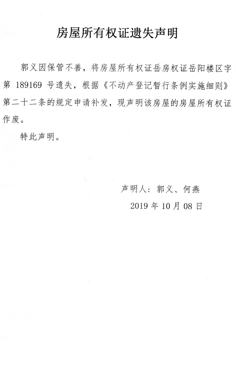 房屋所有权证遗失声明(郭义,房屋所有权证岳房权证岳阳楼区字第189169号)