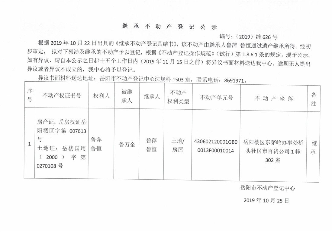 继承不动产登记公示 编号:(2019)继626号(鲁萍)